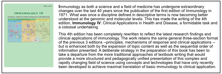 En el prefacio del libro , el Dr. Bellanti explica : " . Lo que antes era una disciplina definida en términos descriptivos que ahora es cada comprenderá mejor a nivel molecular y genómica " Debido a esto y el rápido desarrollo de las opciones de tratamiento , es fundamental para estudiantes , residentes y profesionales a comprender plenamente las implicaciones clínicas de los principios y mecanismos inmunológicos .